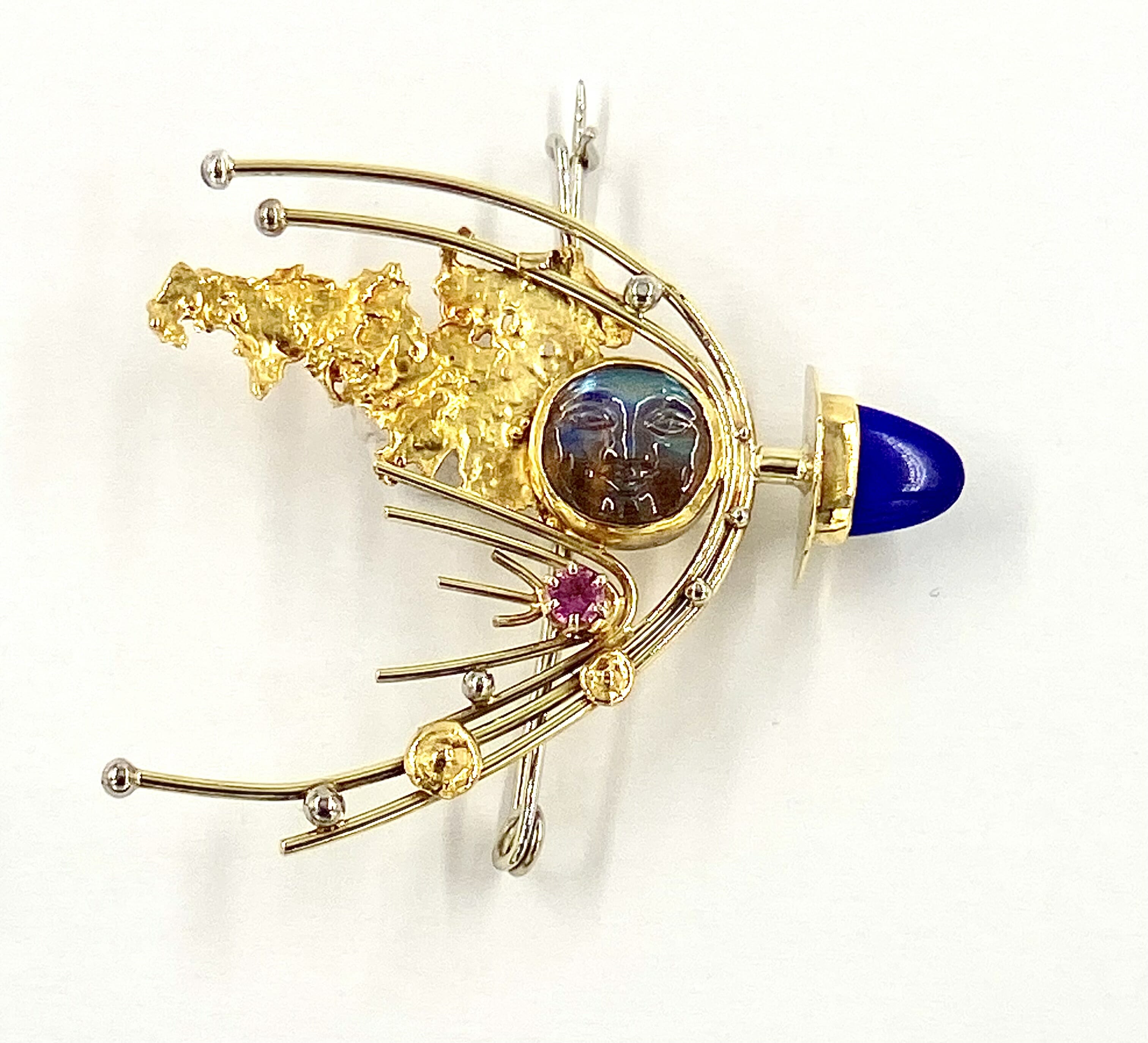 Man in the Moon Riding a Lapulian Comet. 18k and 22k yellow gold, Carved Spectrolite face, lapis lazuli bullet and pink sapphire.